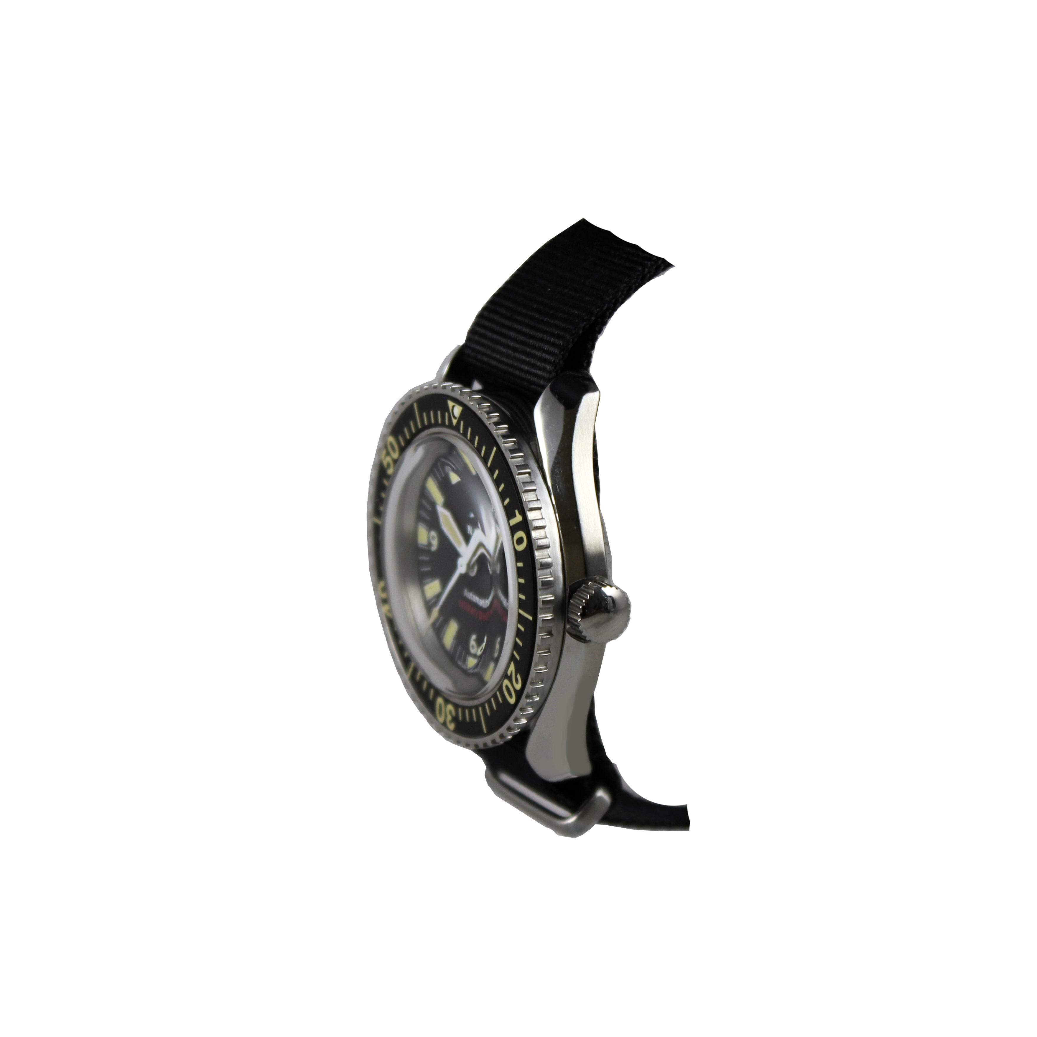 英国海軍ダイバー仕様をベースに、当時のミルスペックを忠実に再現しつつ製作致しました。ケース及びケースバック素材は316Lステンレススティールを採用。ベゼルは当時感を再現するベースに印字した上に樹脂にてカバーする構造に。もちろん現代の機構として逆回転防止機構となっております。風防はアンティーク感を出すためにアクリル製ドーム風防を復刻。日本製オートマチック自動巻ムーブメントを採用し、機能面でも現代の使用に耐えうる製品となってます。文字盤上の数字・インデックス・針の蓄光塗料にはスイス製腕時計にしか使用を許されていない「LumiNova(R)」塗料を採用し、通常のルミナスより蓄光時間・光が強化されています。防水面でも5気圧防水構造ですので日常の水仕事・作業にも充分使用していただけます。