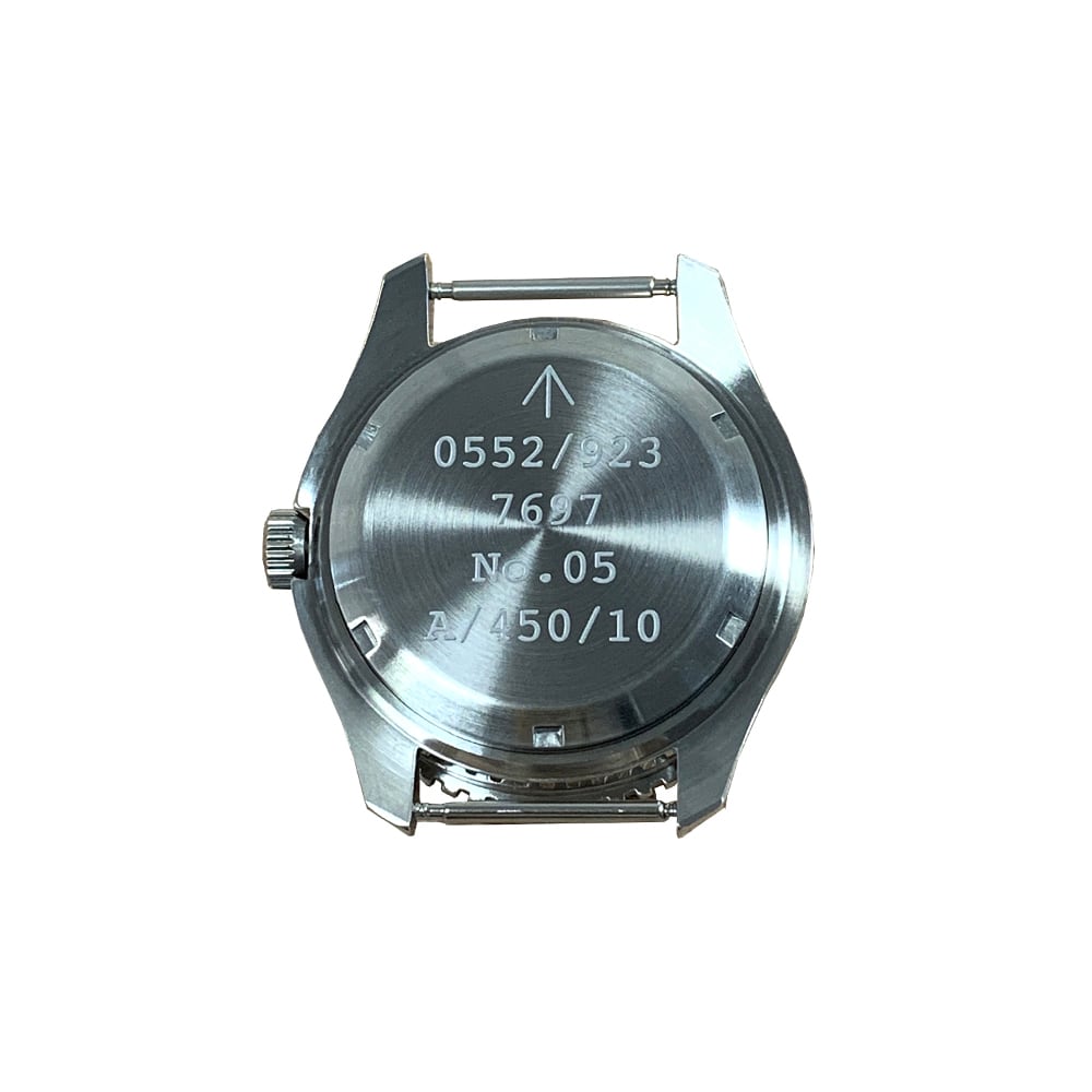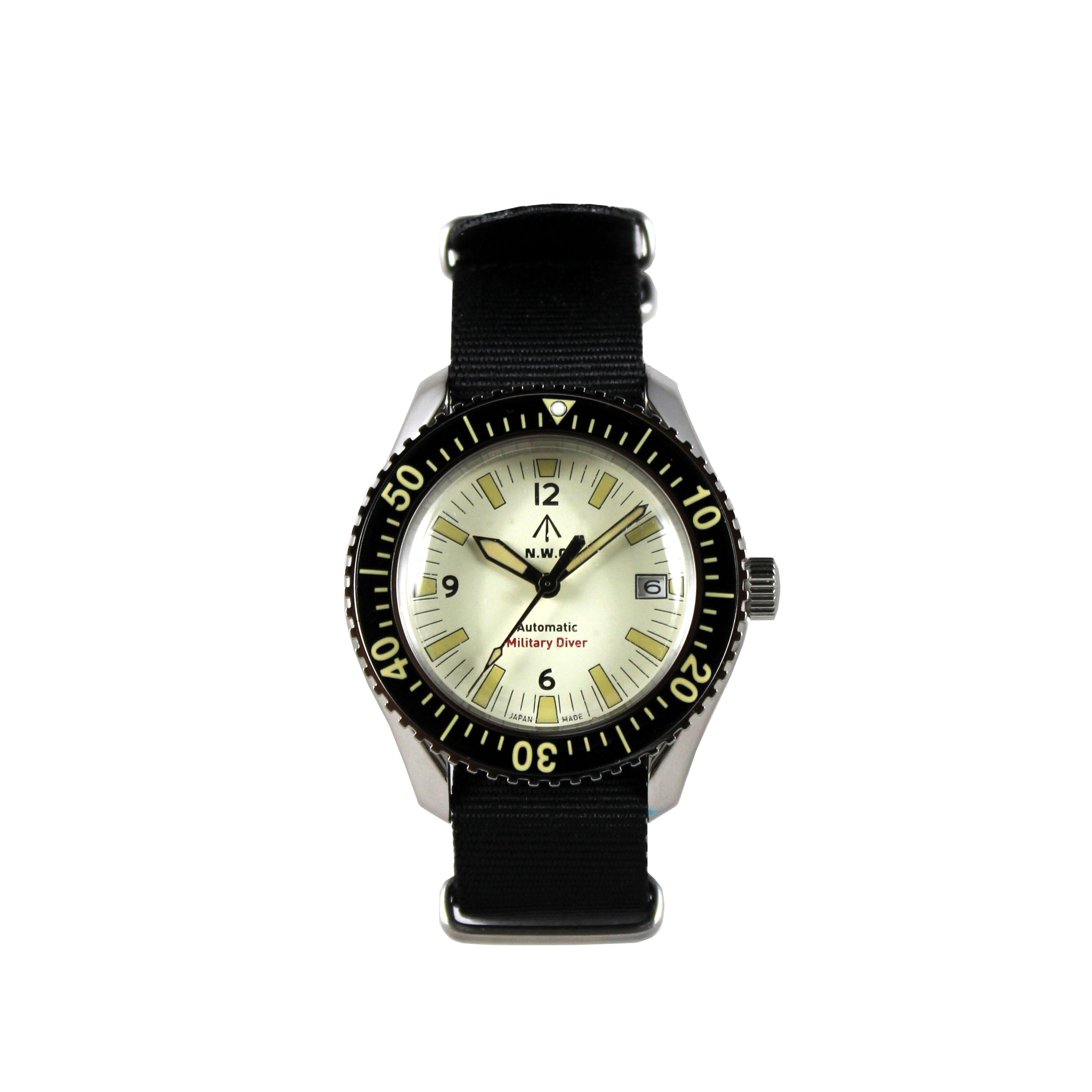 英国海軍ダイバー仕様をベースに、当時のミルスペックを忠実に再現しつつ製作致しました。ケース及びケースバック素材は316Lステンレススティールを採用。ベゼルは当時感を再現するベースに印字した上に樹脂にてカバーする構造に。もちろん現代の機構として逆回転防止機構となっております。風防はアンティーク感を出すためにアクリル製ドーム風防を復刻。日本製オートマチック自動巻ムーブメントを採用し、機能面でも現代の使用に耐えうる製品となってます。文字盤上の数字・インデックス・針の蓄光塗料にはスイス製腕時計にしか使用を許されていない「LumiNova(R)」塗料を採用し、通常のルミナスより蓄光時間・光が強化されています。防水面でも5気圧防水構造ですので日常の水仕事・作業にも充分使用していただけます。