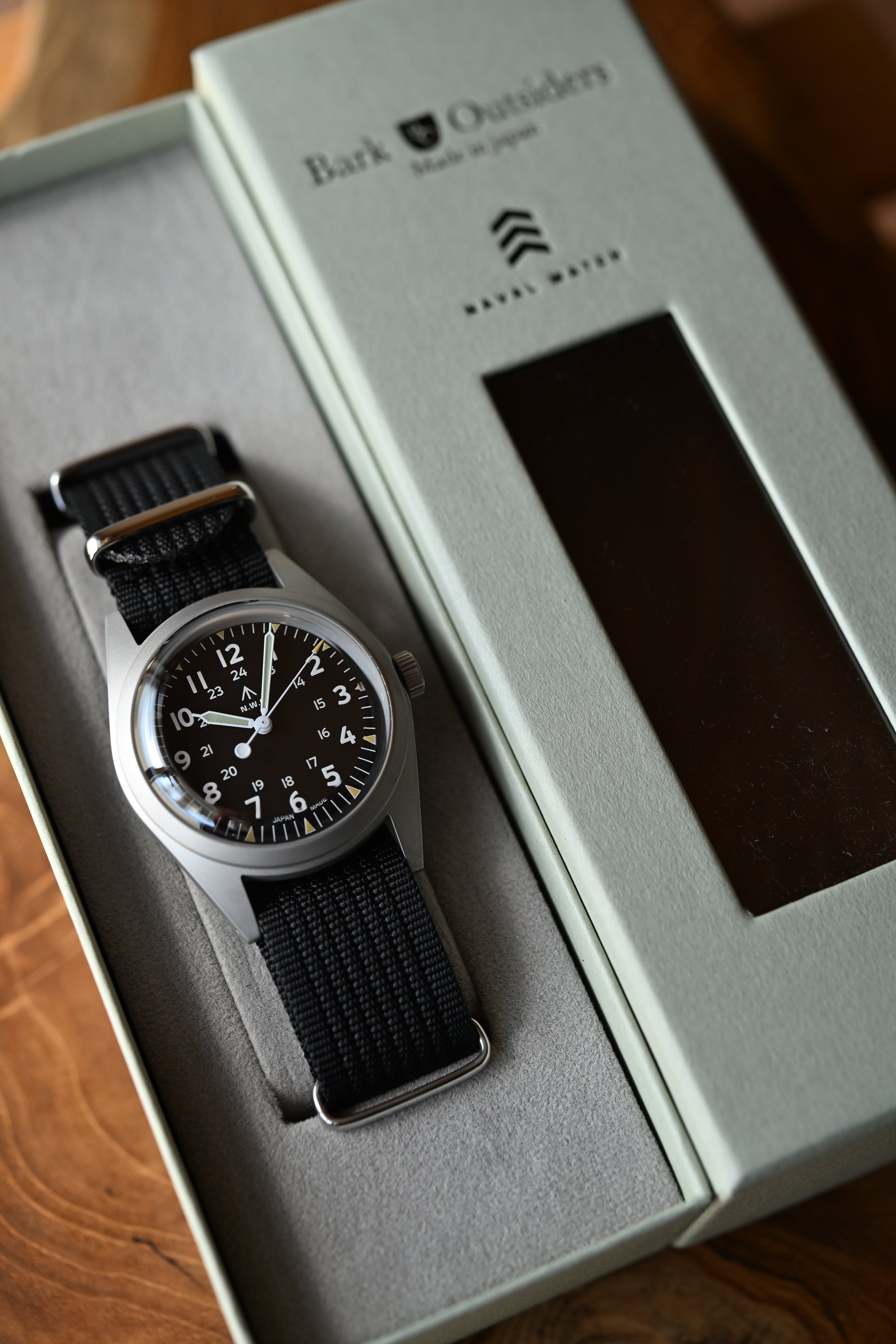 This is the second release in the HOWL line created in collaboration with Barkoutsiders and "NAVAL WATCH." The Naval Watch logo is added to the dial, the shape of the 12-point index on the outer edge has been changed to a triangle (▼), and the luminous color of the hour and minute hands has been changed to a different green than the outer luminous color.