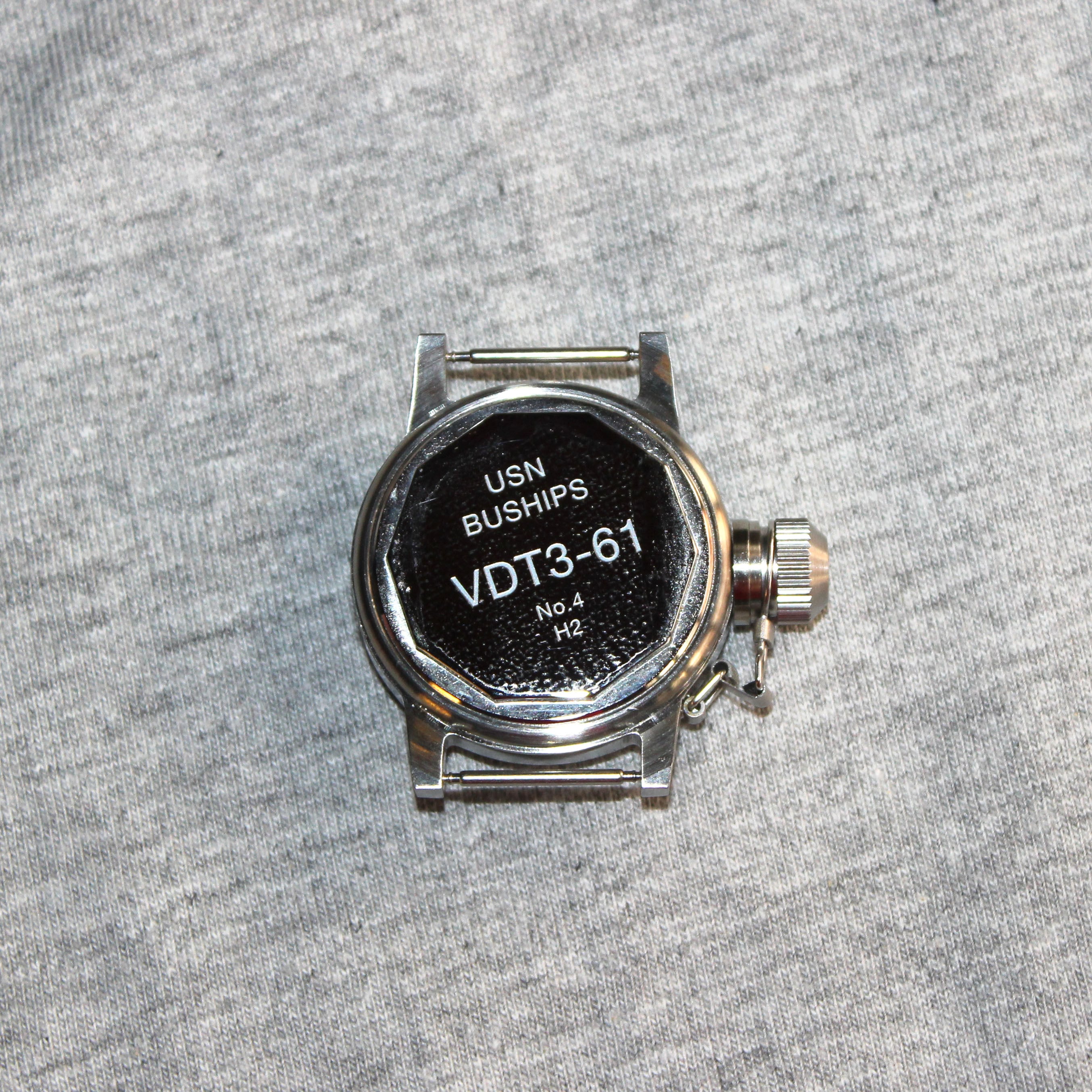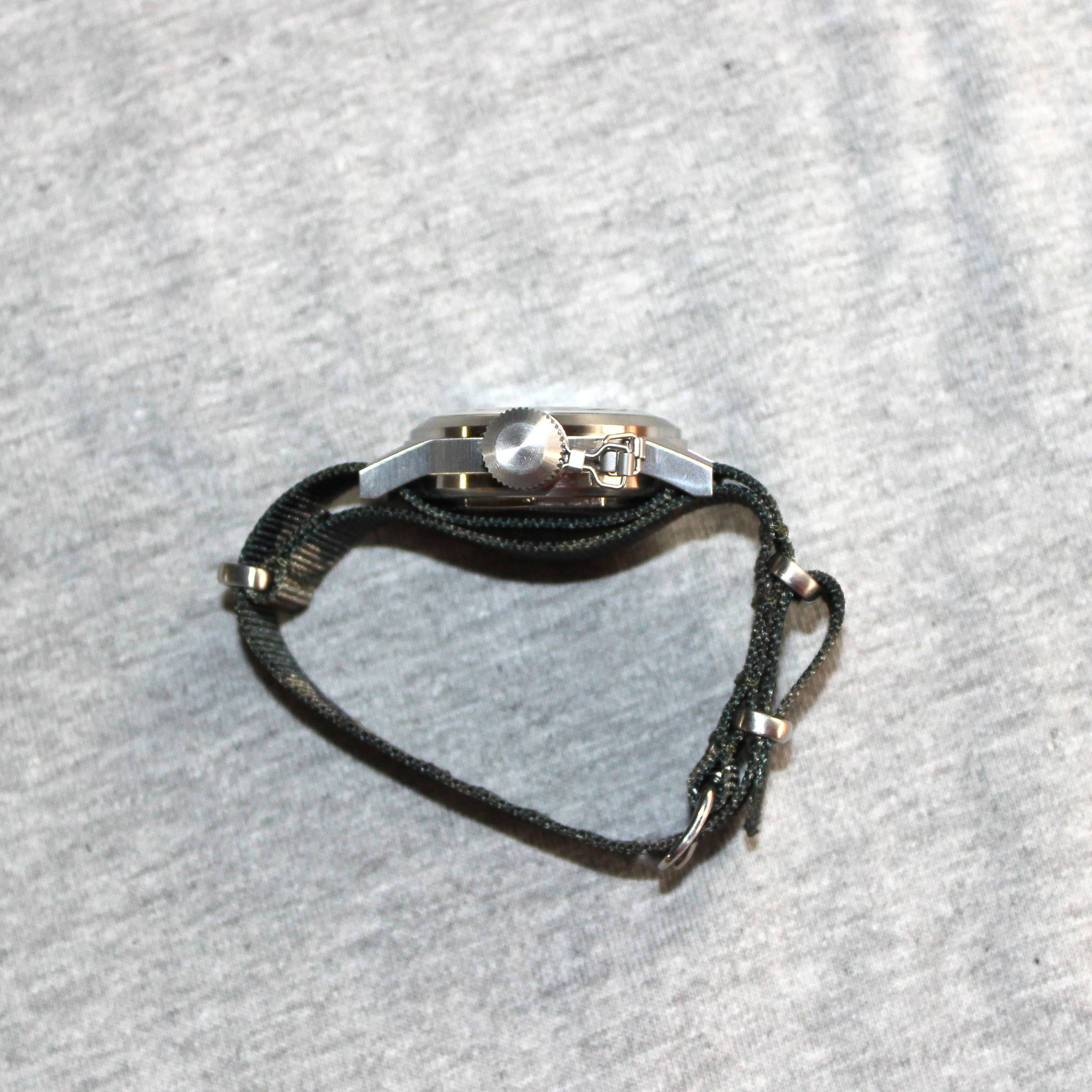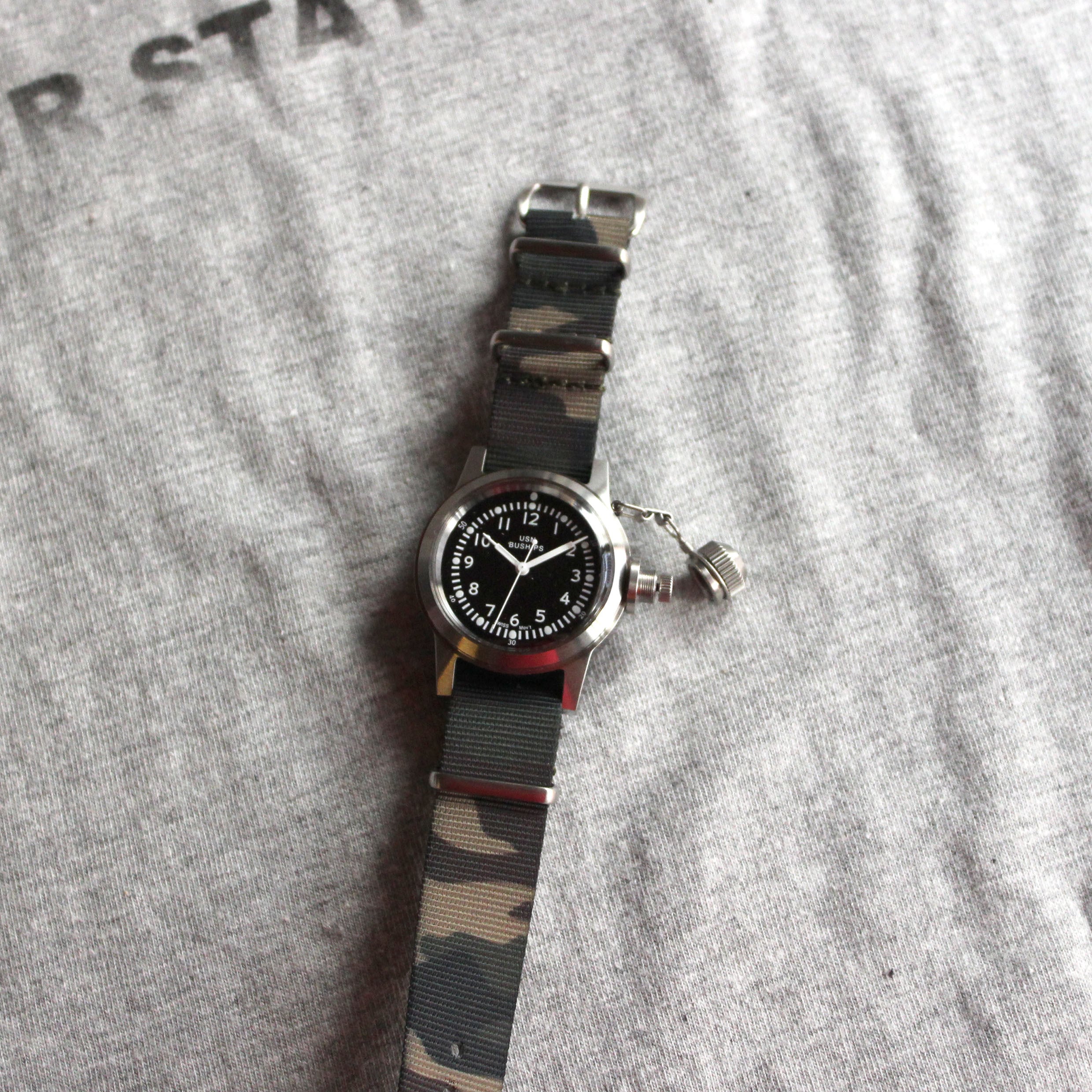 1950年代の米国海軍の特殊部隊であるUDT(Underwater Demolition Team) 水爆チーム 仕様をベースに、リューズ部分にパッキンの入った大型のリューズキャップを着けた特徴を元に、当時のミルスペックを忠実に再現しつつ、サイズ感をアップデートしてケース径を36ミリ(リューズ部含まず)に拡大しました。ケース及びケースバック素材は316Lステンレススティールを採用。風防はアンティーク感を出すためにアクリル製ドーム風防を復刻。スイス製クォーツムーブメントを採用し、機能面でも現代の使用に耐えうる製品となってます。文字盤上の数字・インデックス・針の蓄光塗料にはスイス製腕時計にしか使用を許されていない「LumiNova(R)」塗料を採用し、通常のルミナスより蓄光時間・光が強化されています。防水面でも5気圧防水構造ですので日常の水仕事・作業にも充分使用していただけます。