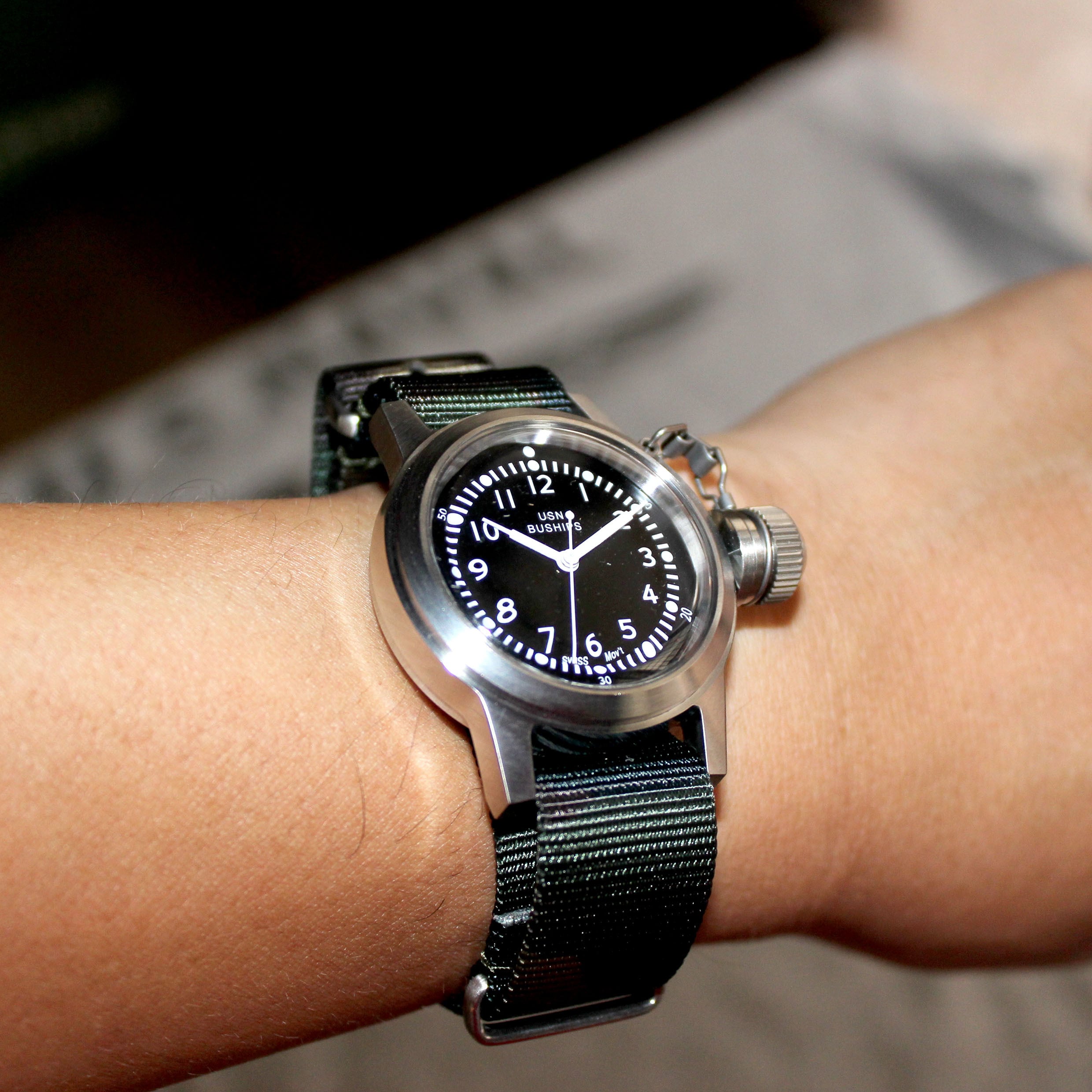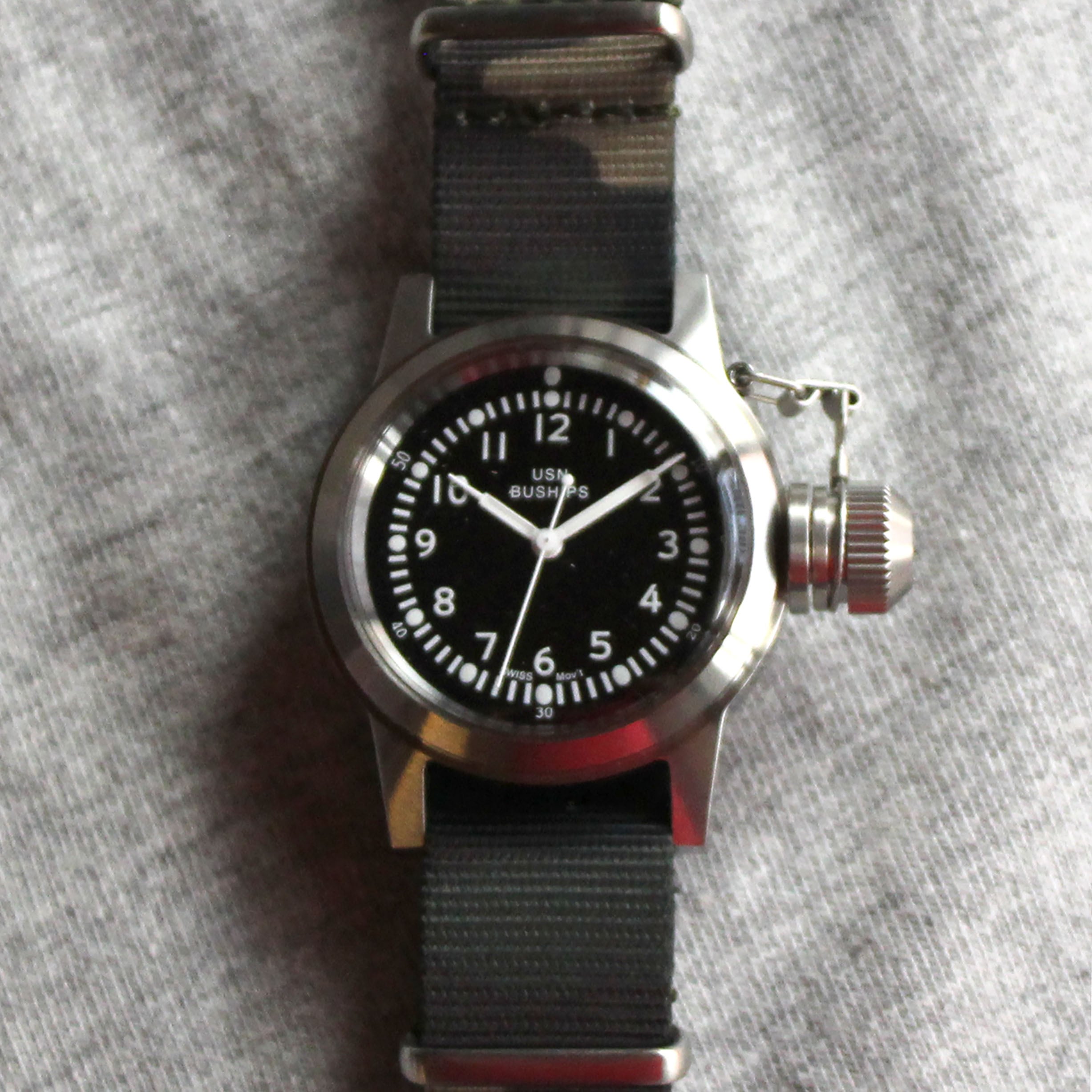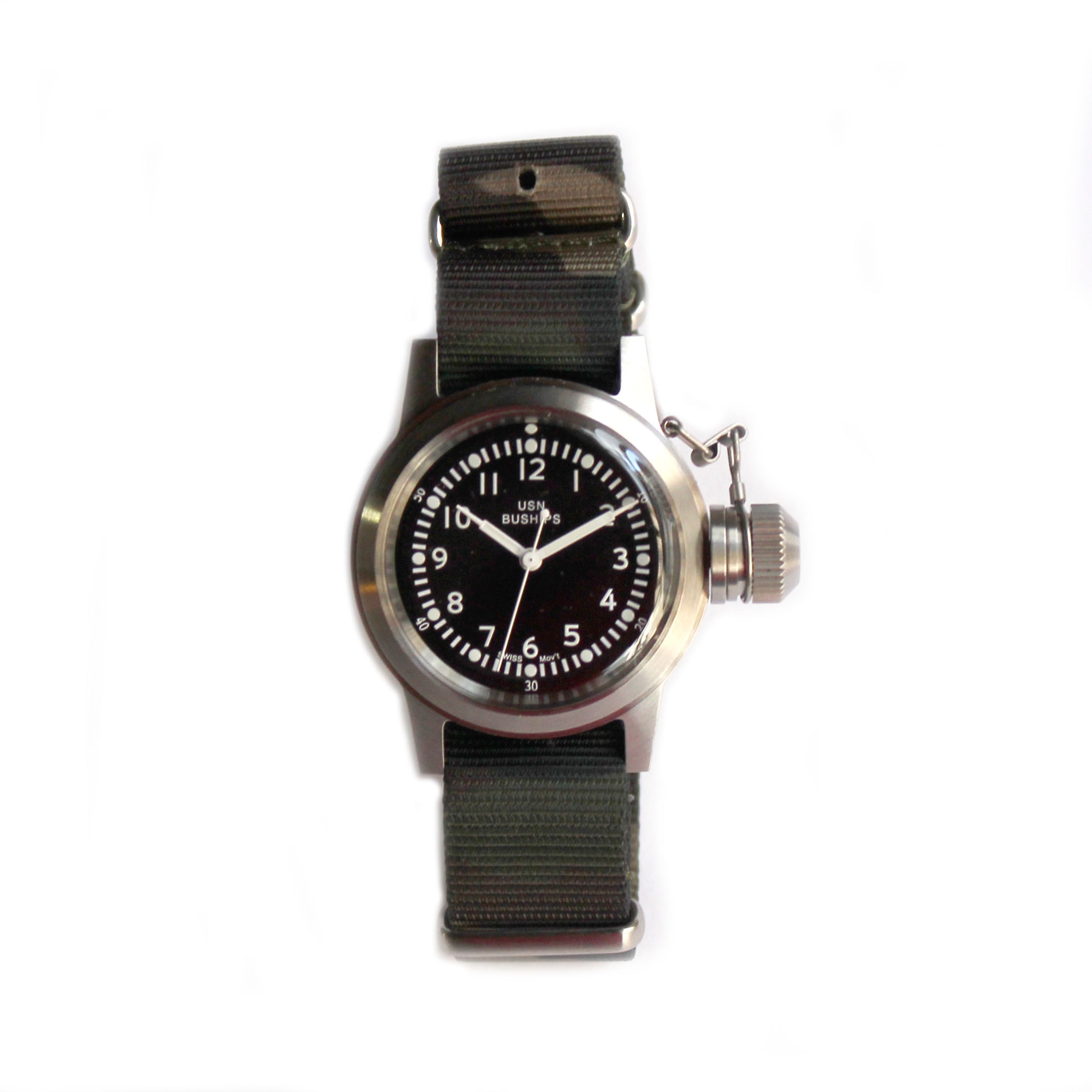 1950年代の米国海軍の特殊部隊であるUDT(Underwater Demolition Team) 水爆チーム 仕様をベースに、リューズ部分にパッキンの入った大型のリューズキャップを着けた特徴を元に、当時のミルスペックを忠実に再現しつつ、サイズ感をアップデートしてケース径を36ミリ(リューズ部含まず)に拡大しました。ケース及びケースバック素材は316Lステンレススティールを採用。風防はアンティーク感を出すためにアクリル製ドーム風防を復刻。スイス製クォーツムーブメントを採用し、機能面でも現代の使用に耐えうる製品となってます。文字盤上の数字・インデックス・針の蓄光塗料にはスイス製腕時計にしか使用を許されていない「LumiNova(R)」塗料を採用し、通常のルミナスより蓄光時間・光が強化されています。防水面でも5気圧防水構造ですので日常の水仕事・作業にも充分使用していただけます。
